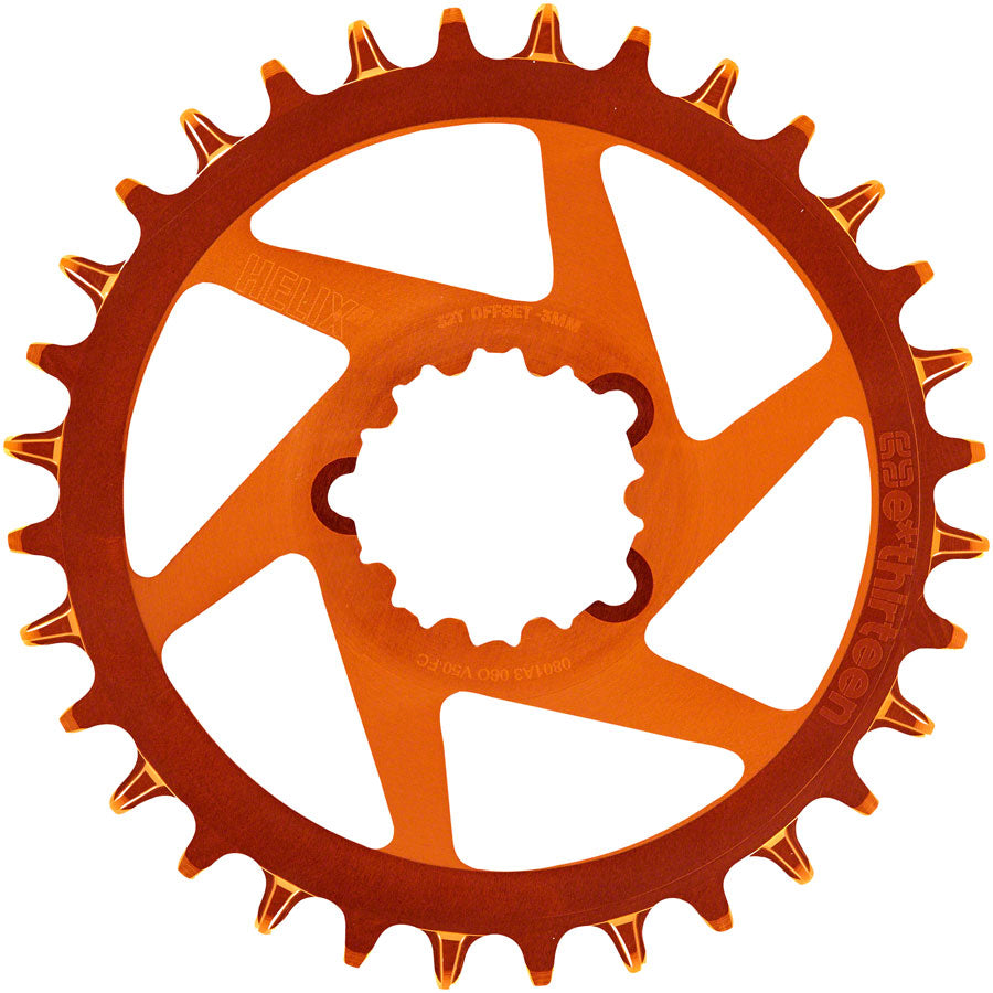 e*thirteen Helix R Guidering - 34t 11/12-Speed 3mm Offset SRAM 3-Bolt DM Naranja. Helix R SRAM Direct Mount Chainrings offer a true upgrade solution for SRAM 3-Bolt MTB crank users (including DUB) to achieve cross compatibility with both SRAM™ and Shimano™ 11 and 12-speed drivetrains.Forged from 7075- T7 aluminum then extensively CNC optimized for industry leading weights and a unique high-end full CNC aesthetic