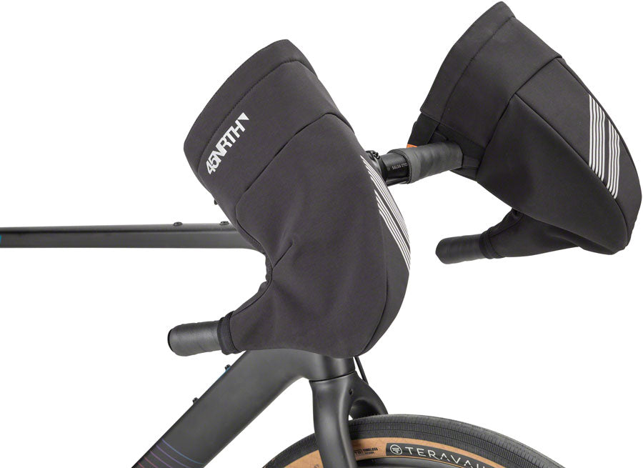 45NRTH Draugenklaw Drop Bar Pogies - Black One Size. Draugenklaw Drop-Bar Pogies keep hands warm and dry and allow for full use of brake and integrated shift levers on cold commutes training rides race days and touring in uncertain weather. Weather-resistant softshell fabric on the outside defends against wind and water. On the inside soft fleece traps warmth for a cozy cockpit. Easy installation means you can put them on only when ride conditions call for it. Maximize comfort and minimize weight with Draugenklaw Drop-Bar Pogies.Wind resistant soft shell coverage