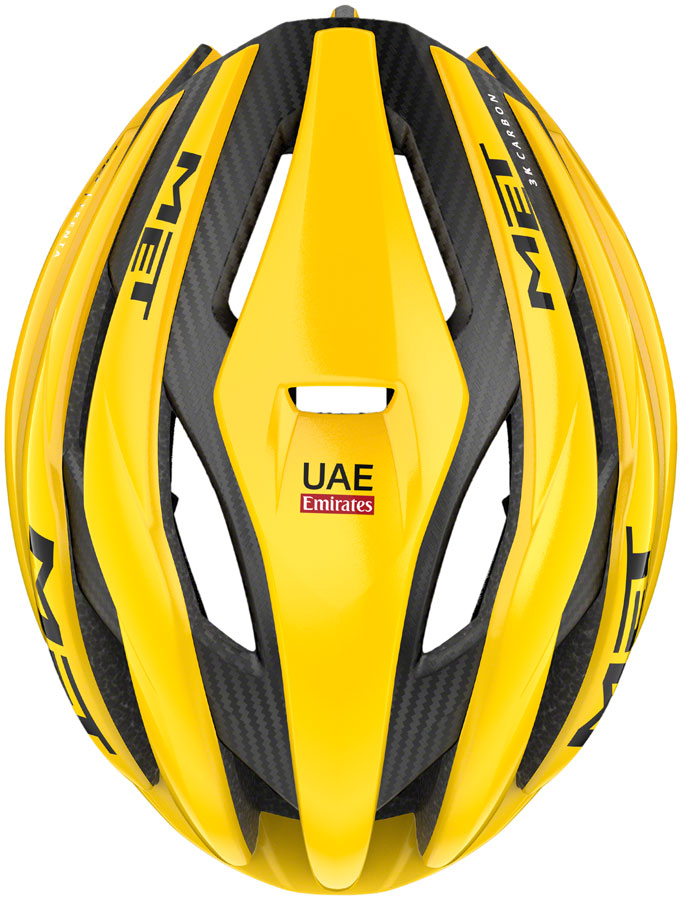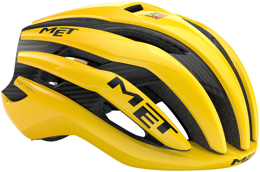 MET Trenta 3K Carbon MIPS Helmet - Jaune Limited Edition Medium. The model worn by Tadej Pogacar in his 2024 Le Tour de France and Giro d’Italia victories the MET Trenta 3K Carbon MIPS is a performance road helmet for elite cyclists. This helmet features MIPS AIR technology which is engineered to reduce rotational energies otherwise transferred to the head during specific angular impacts with a super-lightweight design. Scientifically designed air vents harness the power of the Venturi effect pushing out warm air within the helmet through specially positioned exhausts to ensure constant airflow. The tail of the helmet also features an aerodynamic design to effectively drive airflow.In-mold polycarbonate shell with EPS liner