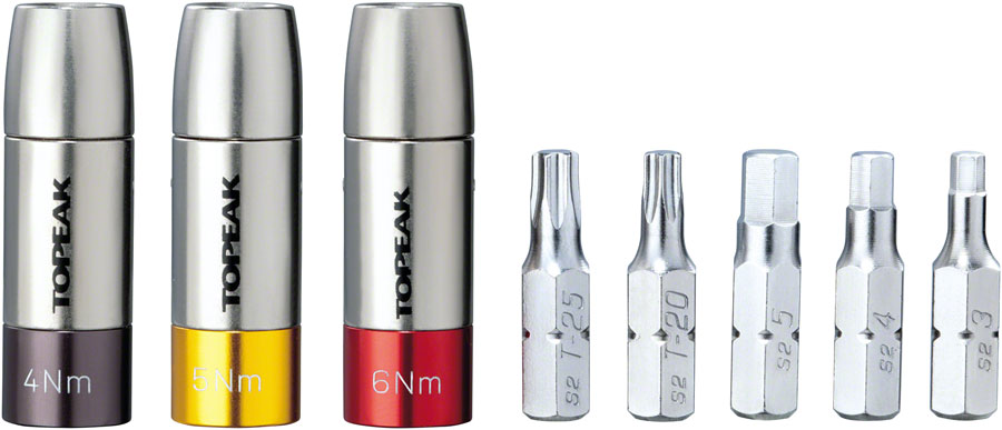 Topeak Nano Torqbox DX Tool Kit. This tool set consists of 4 / 5 / 6Nm TorqSockets that will work with any mini tool containing a 5 mm Allen wrench (or single 5 mm Allen wrench). Its advanced torque limit release design consistently applies precise torque values on component bolts for safety and prevents damage to expensive carbon parts. A carry case neatly stores three preset TorqSockets (4 / 5 / 6Nm) and the 5 most popular tool bits (3 / 4 / 5 mm hex & T20 / T25 Torx).