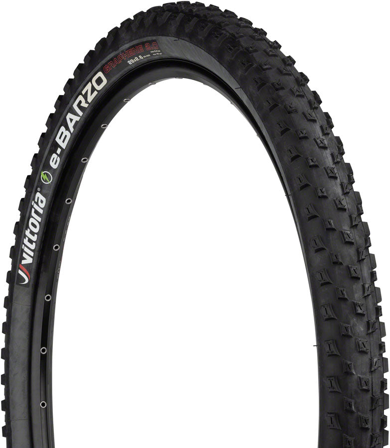 Vittoria e-Barzo Tire - 29 x 2.6 Tubeless Folding Black/Anthracite TNT G2.0. The e-Barzo is your choice for traction and range perfect for riding technical XC terrain with an e-bike. The magic starts in the center tread featuring an alternating ridge design and progressive sipe angles helps to keep this tire rollling fast. Cornering duties are handled by the moto-style block knobs laid out in a proven V-formation. The result is a tire that corners as fast as it rolls while still offering the protection of a full depth tread.